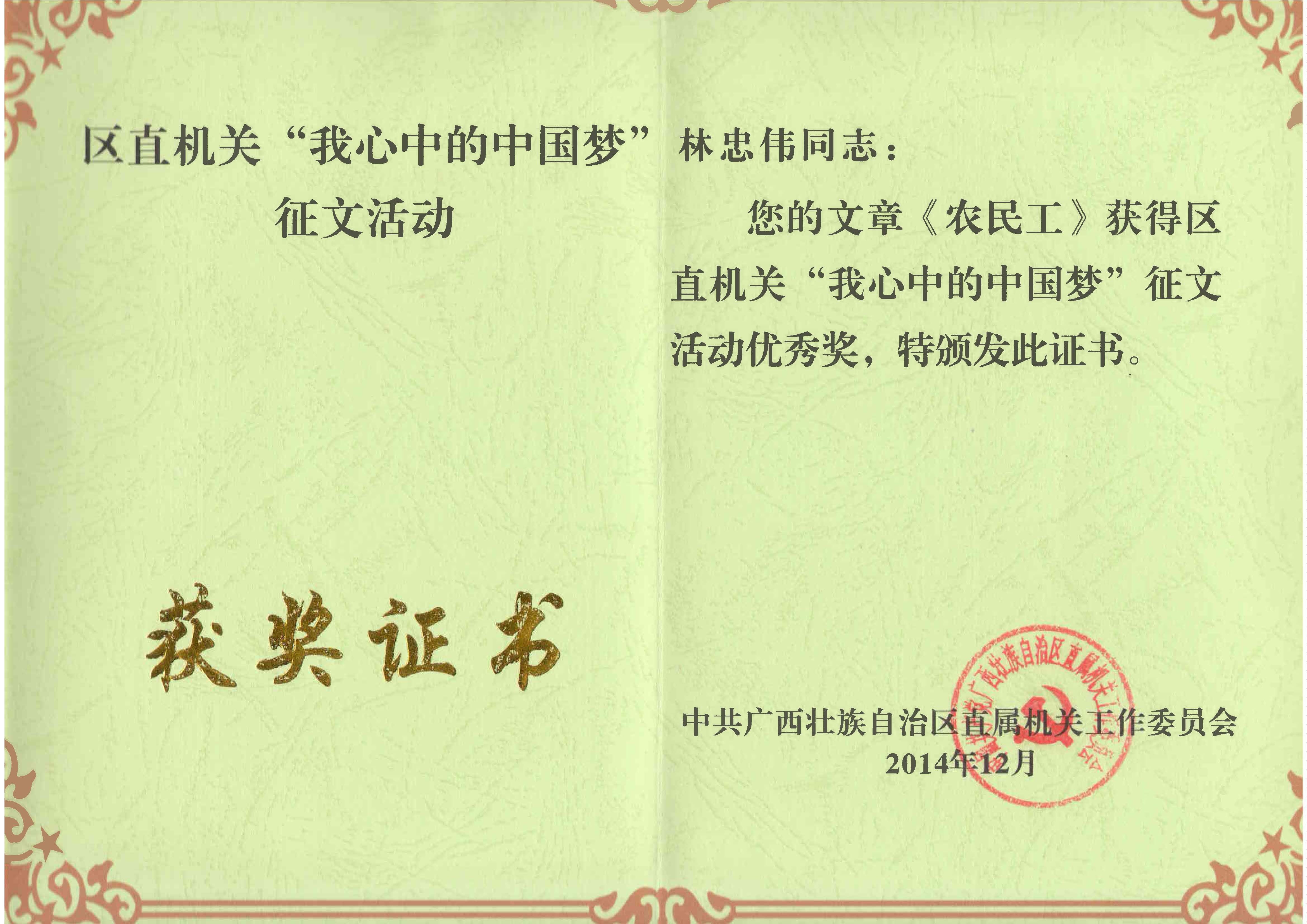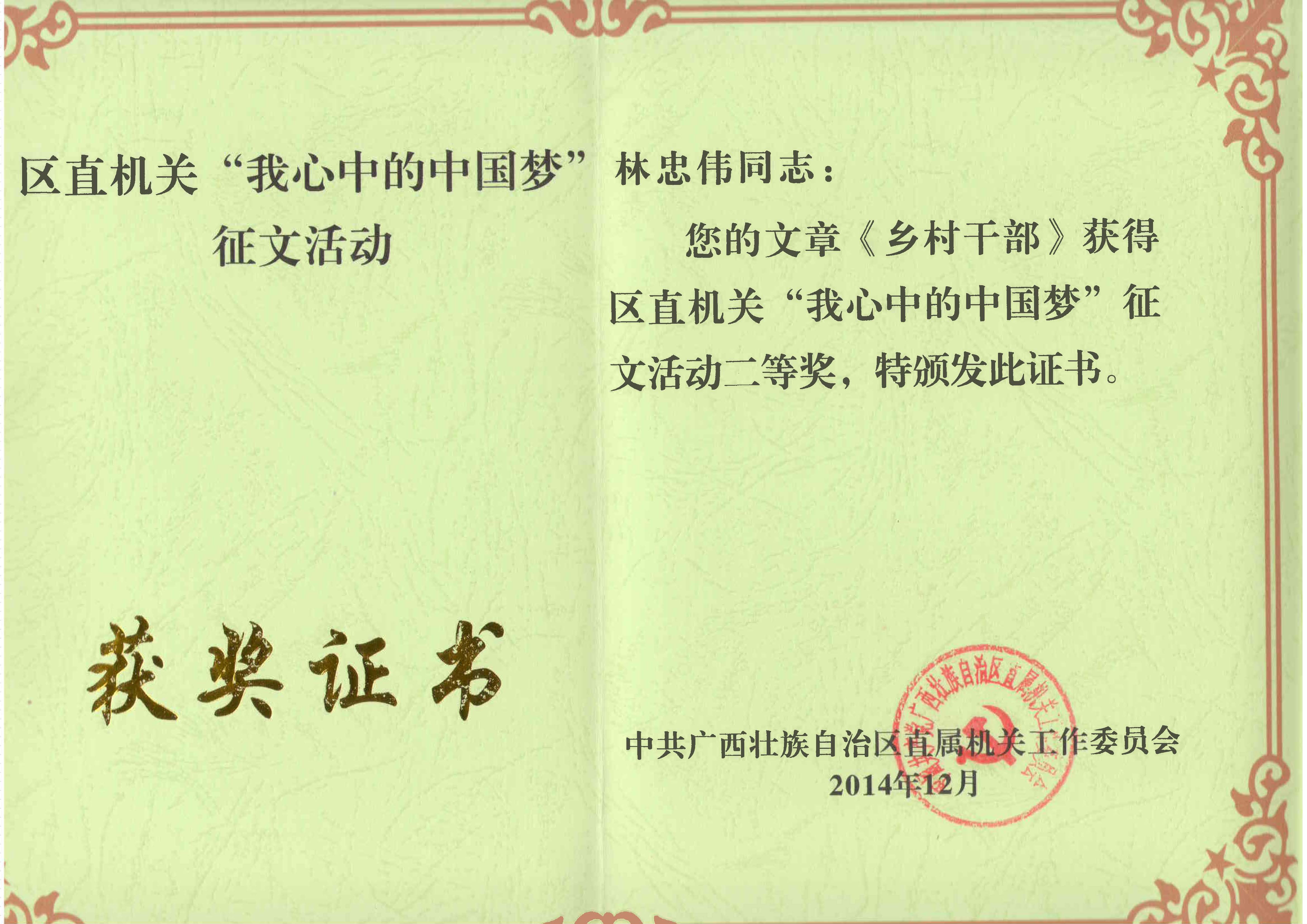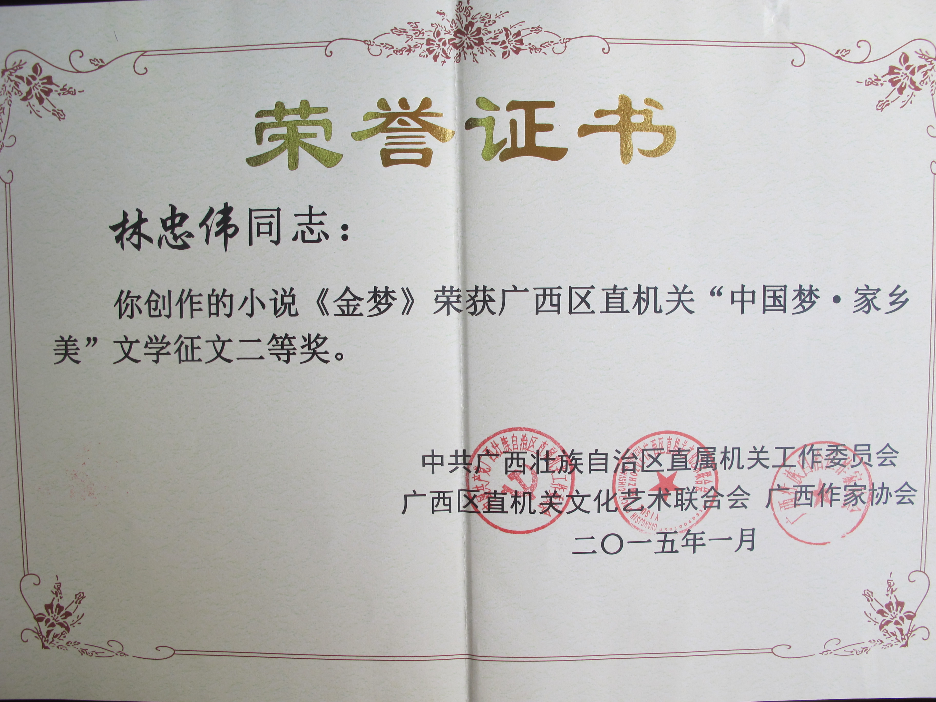 林忠伟同志另外一篇作品《金梦》荣获自治区直属机关工作委员会、广西区直机关文化艺术联合会、广西作家协会联合举办的“中国梦·家乡美”文学征文活动评比二等奖。为我院争了光添了彩。