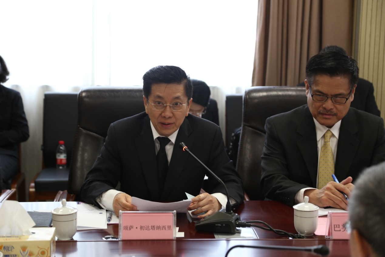 2017年5月22日上午,泰国预算委员会主席颂萨率代表团一行18人到我院就广西经济社会发展情况进行座谈交流,广西社会科学院党组副书记、副院长谢林城、党组成员、副院长黄天贵和工业经济研究所、区域发展研究所、东南亚研究所、院办公室有关人员以及泰王国驻南宁总领事馆领事陈大伟出席座谈会。