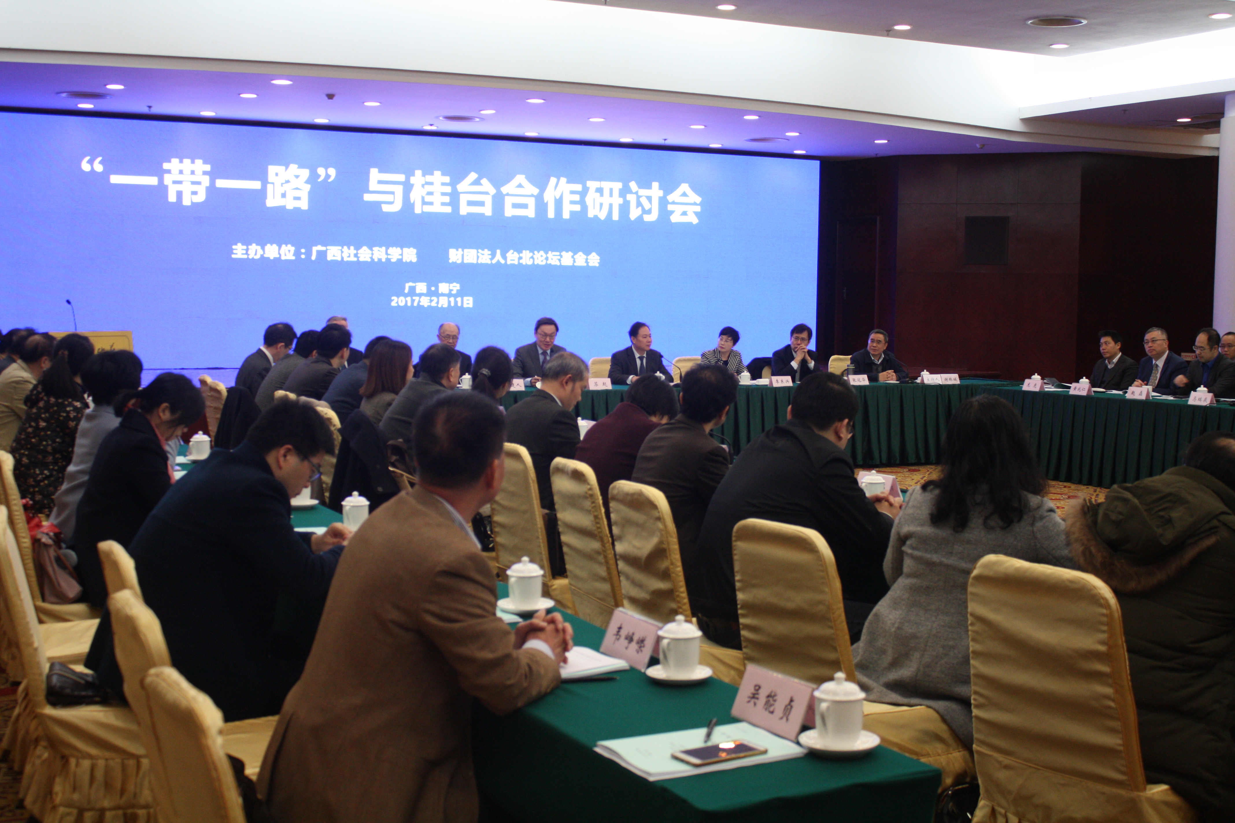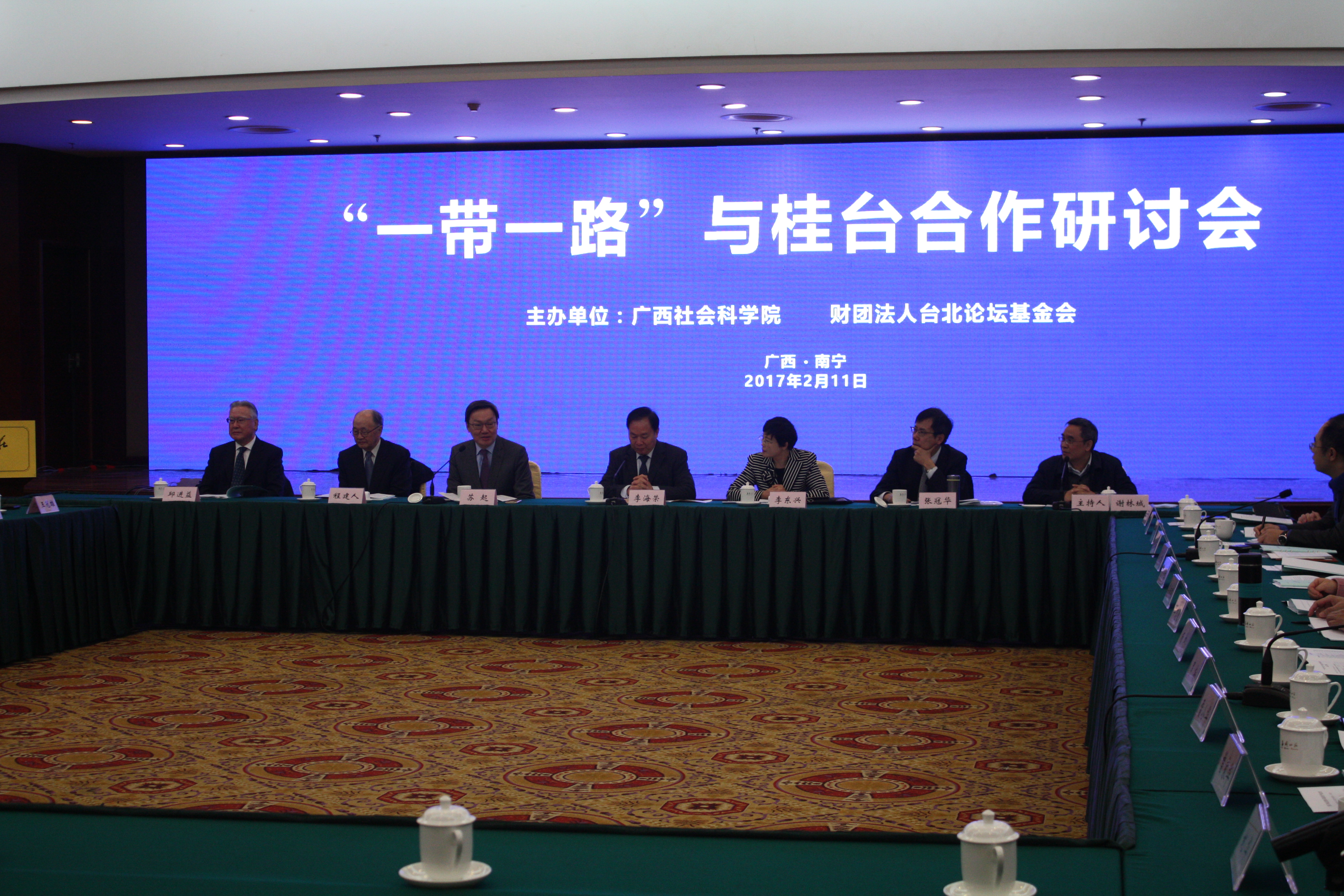 2017年2月11日上午,由我院与财团法人台北论坛基金会共同主办,以“一带一路”建设与桂台合作展望为主题的“一带一路”与桂台合作研讨会在南宁荔园山庄酒店举行。来自海峡两岸的50余位专家学者汇聚一堂,共同为“一带一路”建设和桂台合作建言献策,成为今年新春以来桂台两地智库的首个重要交流活动。