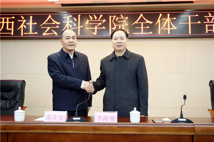 会上,自治区党委组织部副部长、自治区非公有制经济组织和社会组织党工委书记莫达流宣读了自治区党委关于我院主要领导职务任免的通知,自治区党委决定,任陈立生同志为广西社会科学院党组书记、院长,免去李海荣同志广西社会科学院党组书记、院长职务。莫达流副部长指出,李海荣同志到社科院任职以来,带领全院干部职工奋发进取,社科院的社会地位稳步提高,智库作用明显增强,得到了自治区党委的充分肯定和认可。他同时指出,陈立生同志政治坚定,工作经历丰富,又有社科院工作的经验,希望陈立生同志团结新班子,带领社科院取得更好的成绩。