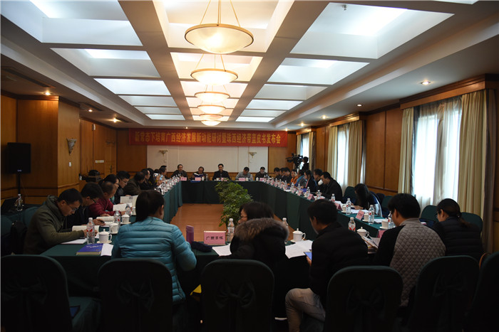 2017年12月16日上午,广西蓝皮书《2017年珠江—西江经济带发展报告》新闻发布会在南宁举行。自治区发改委、工信委、西江集团等单位代表和广西大学、广西民族大学、广西师范学院、广西社会科学院等单位的专家、学者出席了新闻发布会。