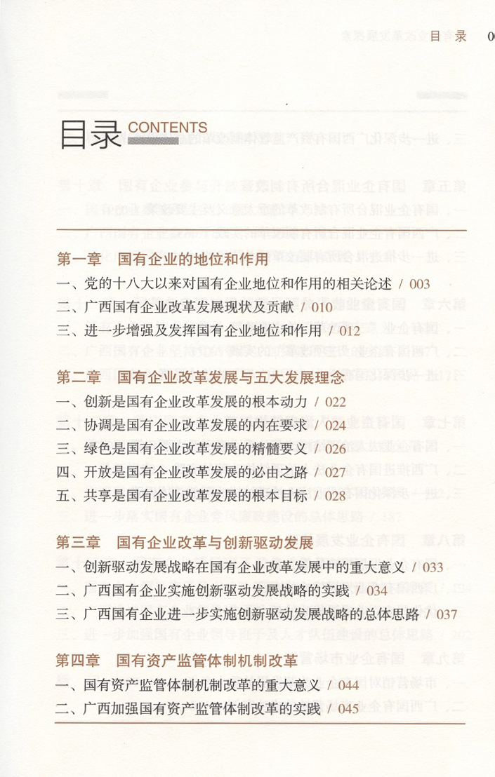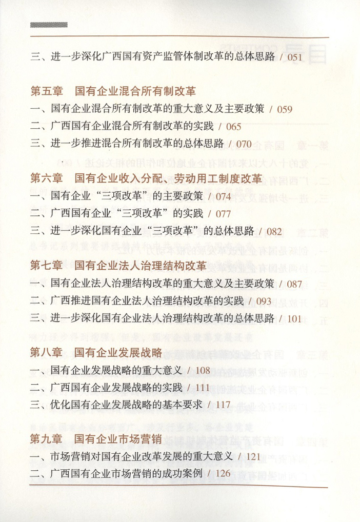 全书共分13章,探讨了国有企业地位作用、国有资产监管体制机制改革、混合所有制改革、加强国有企业党的领导和党的建设、国企改革创新、参与开放合作“走出去”等重大问题,结合广西国有企业的特点及现状,较为系统地介绍了国有企业发展面临的主要问题和发展趋势,提出了进一步做强做优做大国有企业的方向、路径、政策及措施。
