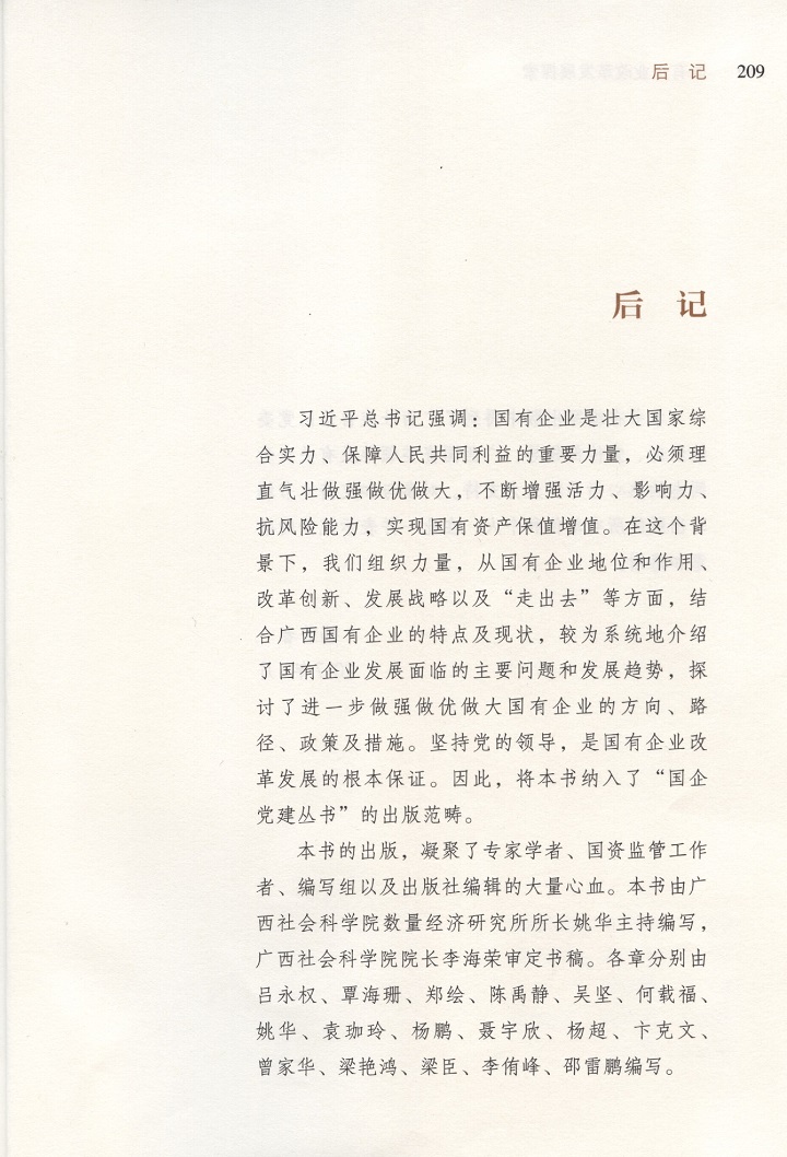该书由广西人民出版社“国企党建丛书”编写组委托我院编撰。我院数量经济所、区域经济所、哲学所、工业经济所、农发所、社会学所、东南亚所的16位科研人员承担了书稿的写作任务。编写组的科研人员克服了时间短、任务重、资料分散等困难,在短时间内完成了书稿的编撰,部分章节还几易其稿。可以说,在对这些文稿反复修改的同时,也是我院科研人员对国有企业改革发展的一个重新思考和深入探索的过程。