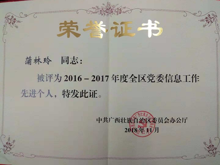 为充分发挥先进典型的示范引领作用,进一步激发各地各部门各单位和广大信息督查工作者的积极性、主动性和创造性,推动全区党委信息督查工作再上新台阶,自治区党委办公厅决定对南宁市委办公厅等80个“2016-2017年度全区党委信息工作先进单位”,雷英同志等100名“2016-2017年度全区党委信息工作先进个人”,南宁市委督查室等80个“2016-2017年度全区党委督查工作先进单位”,唐之彦同志等100名“2016-2017年度全区党委督查工作先进个人”进行表彰。我院蒲林玲同志被评为“2016-2017年度全区党委信息工作先进个人”。
