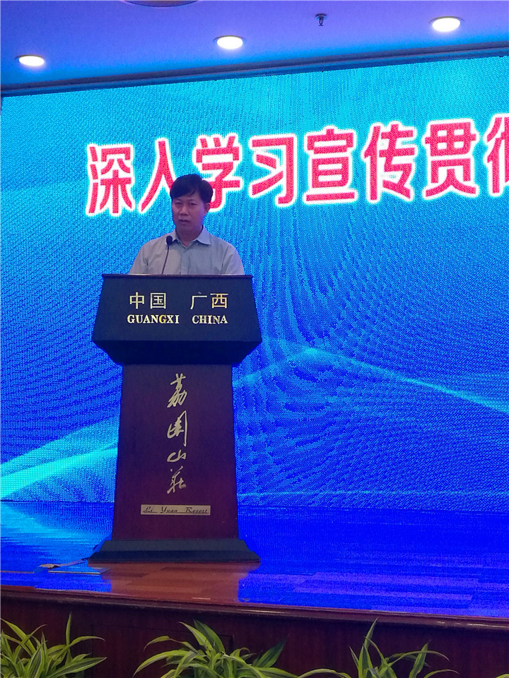2018年5月31日,由自治区党委宣传部主办的“深入学习贯彻习近平新时代中国特色社会主义思想”研讨会在南宁召开。参加会议的有自治区党委领导,中央宣传部、中央党校、中国社科院有关专家领导,人民日报社、求是杂志社、光明日报社、经济日报社有关领导、专家,自治区党委政策研究室、自治区党史研究室、自治区政府发展研究中心、自治区党校、百色干部学院有关领导,自治区直属机关工委、高校工委、国资委党委、农垦工委、两新组织党工委有关领导,各设区市党委常委、宣传部长及分管理论工作的副部长,自治区党委宣传部部务会议领导,自治区宣传文化系统各单位主要负责人,全区设有马克思主义学院高校的马克思主义学院院长,广西日报社、广西人民广播电台《说事说理》节目、广西电视台《凡事说理》节目负责人,广西入选全国文化名家暨“四个一批”及广西文化名家暨“四个一批”理论人才,中央驻桂主要新闻媒体负责人,部分入选论文代表,共约140人。