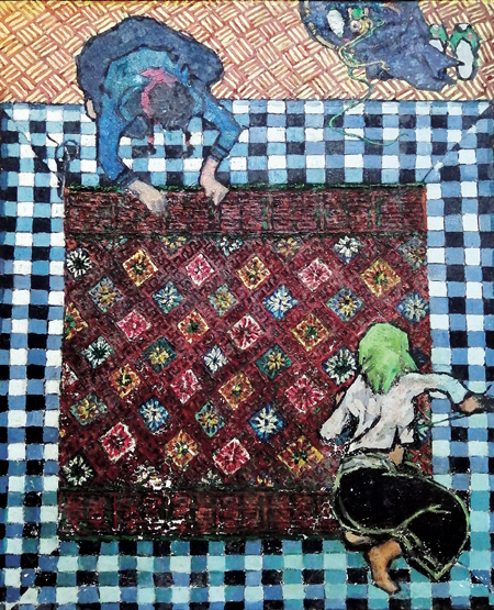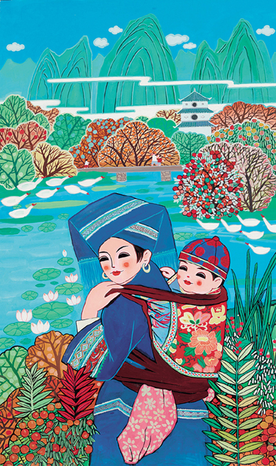 展现边疆情景是画展的独特之处。靖西壮族农民画家擅长从自己的日常生活中取材。一方面,他们聚焦于自家小院。 《农家生活》《农家小院》呈现的是边疆壮族同胞朴实而热闹的庭院场景。而《我给房子换新颜》 《喜迁新居》则表现了人们忙碌中的“喜”气。 《新被》更是借助两位妇女缝新被子的画面,传达“把温暖缝进被里”的幸福感觉。这样紧接地气、亲切感人的作品,让观众看到了靖西壮族农民的生活常态,产生了由衷的赞叹与羡慕:“哦!祖国边疆乡村就是这样幸福的! ”于是,遥远的边境变成了亲近的乡邻。另一方面,他们细腻地描绘边境家乡的独特景象。有秀美的山水风光和朴素的民宅村寨,如《边关人家》 《乡村晨曲》 《家乡小河》 《小桥流水人家》 《古镇小景》 。有对中越民间边贸活跃的写实,如《 ‘一带一路’活边贸》 《边关牛市》 《龙临牛市》 。还有再现中越边民和睦相处、载歌载舞的《边关斗牛闹新春》 《欢乐边关》 《和平之鸽》等。这让我们看到了当下中越边境的睦邻友好、和平安宁、互助共荣的真实景象。