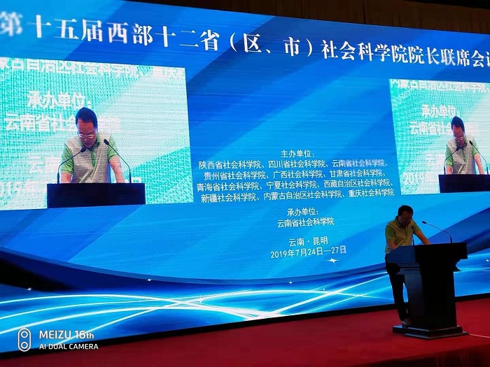 在全党深入开展“不忘初心、牢记使命”主题教育活动之际,2019年7月25日,由云南省社会科学院主办的第十五届西部十二省(区、市)社科院院长联席会议暨民族文化与旅游深度融合发展论坛在气候宜人、风景如画的昆明召开。这次会议是西部十二省(区、市)社科系统深入学习贯彻习近平新时代中国特色社会主义思想、促进新时代西部崛起的高层次理论研讨和学术交流的盛会。 会议的主题为“建国七十年来西部地区经济社会发展成就、主要经验及未来发展”,同时还就西部地区民族文化促进旅游产业发展展开研讨。云南省委常委、宣传部长赵金出席会议并致欢迎辞,会议由云南省社会科学院党组书记、院长何祖坤主持。来自西部十二省区市社科院的100多位专家学者与会,我院黄天贵副院长、王建平所长、覃娟所长、卞克文副所长应邀参加了这次会议。