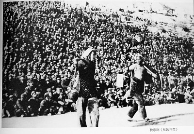 这幅剧照的主角并不只是在广场中央的艺术家,而且还有他们背后的观众。那密密麻麻的男女老少几乎占满了整个画面,这样的构图鲜明地表现出观众也是主人公。仔细看去,画面中戴军帽的是八路军战士,扎头巾的是农民,戴眼镜的当然是知识分子,其中应该还有工人。前排的席地而坐,中间的袖手而站,后面的干脆坐在山坡上,漫山遍野,人山人海。两万多各界军民都在认真看戏。他们的成分就如毛泽东主席说的:“最广大的人民,占全人口百分之九十以上的人民,是工人、农民、兵士和城市小资产阶级。”有意思的是,他们是在演员的背后观看表演的。这说明当时延安城南门广场的演出是开放的,观众是围在广场中央的旁边,从四面八方的不同角度欣赏演出。这种观看形式彻底地打破了戏剧艺术的第四堵墙,使观众和演员几乎零距离,进而产生最直接的审美交流,互动更密切,气氛更热烈。