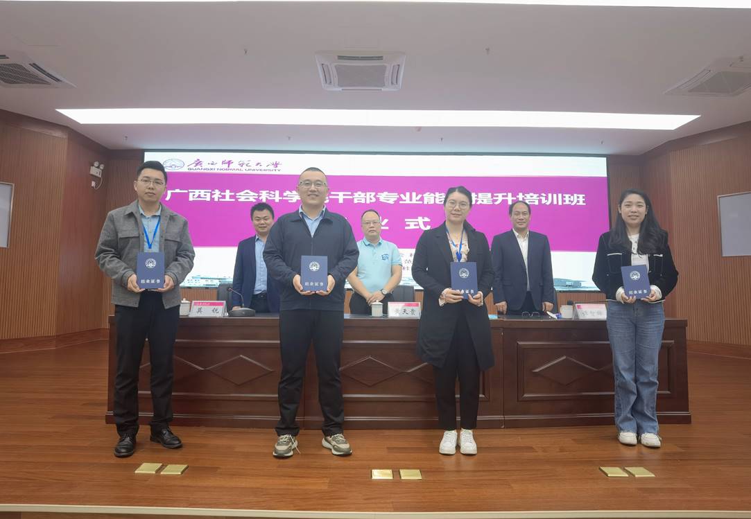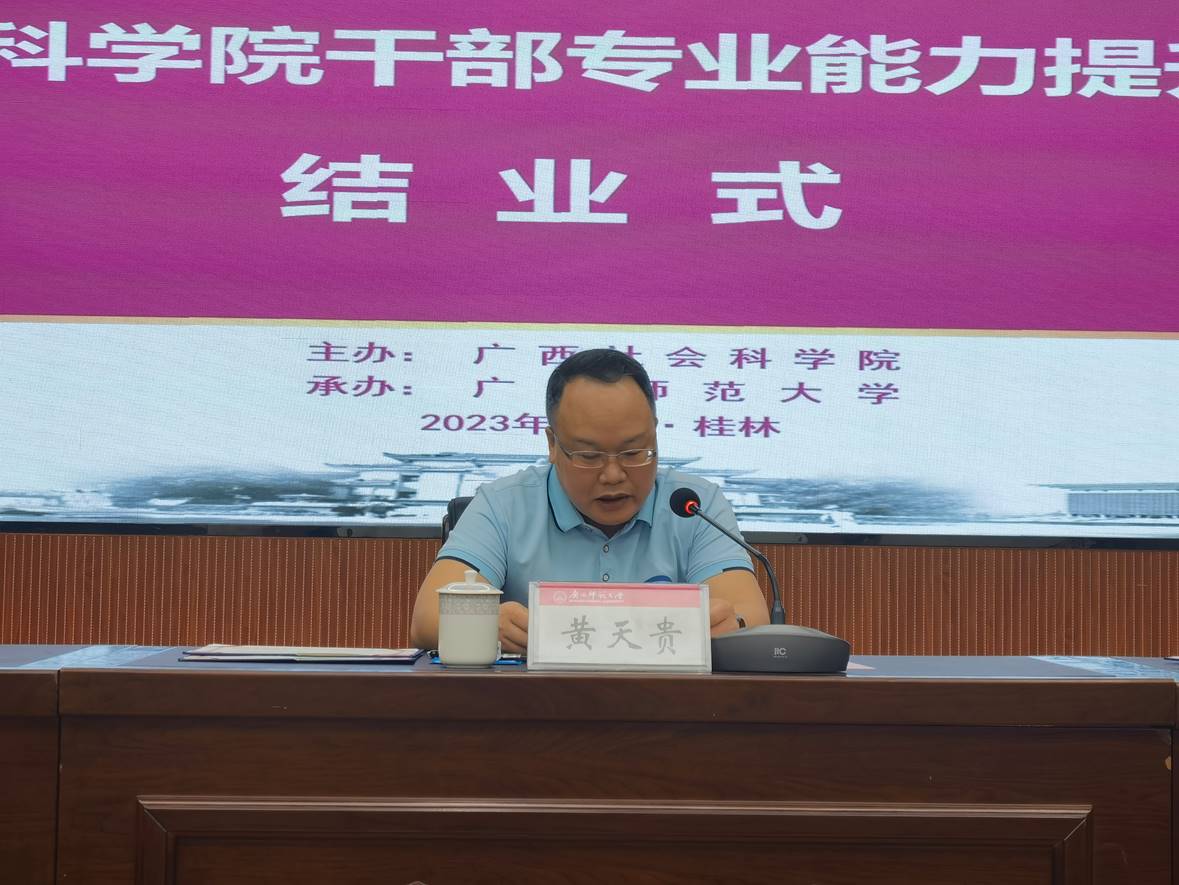 2023年11月10日上午,广西社会科学院干部能力提升培训班圆满完成各项课程安排并举行结业式。广西师范大学党委组织部常务副部长谭智雄在结业式上致辞。广西师范大学干部教育培训学院市场部主任莫锐主持结业式。院党组成员、副院长黄天贵出席结业式且作总结讲话,并为学员代表颁发结业证书。